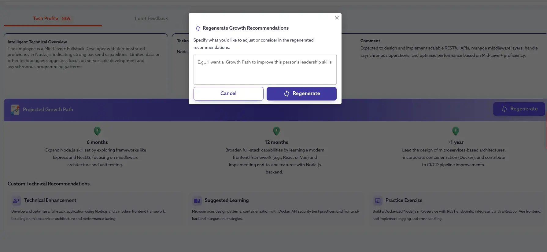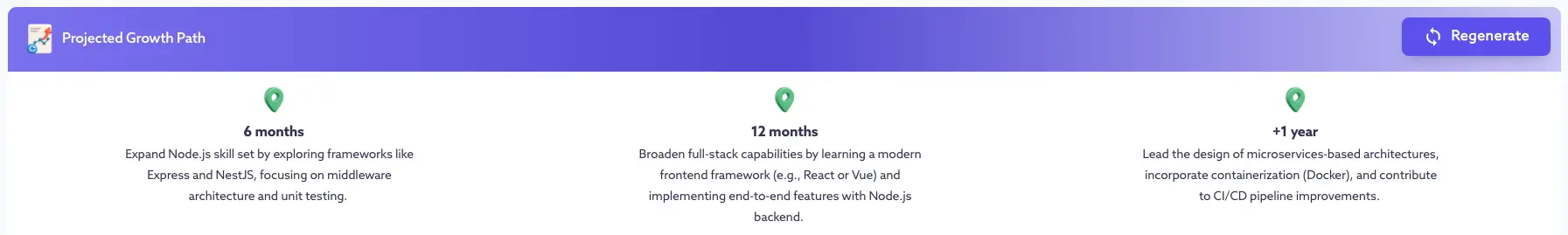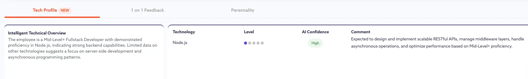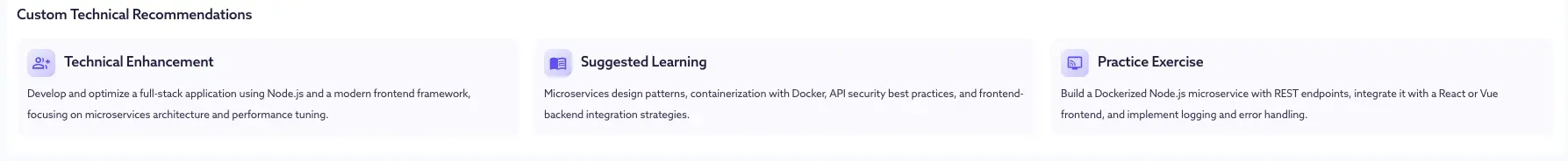 Tech Stack Proficiency:Â Clear assessment of current skills (e.g. Node.js, React) with AI confidence level.
