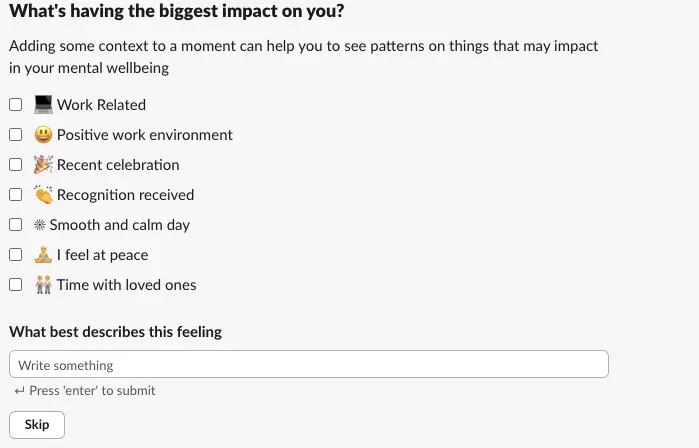 A new "Work Related" reason has been added to all mood types—positive and negative—allowing users to provide more contextual information behind their emotional state with greater flexibility.
