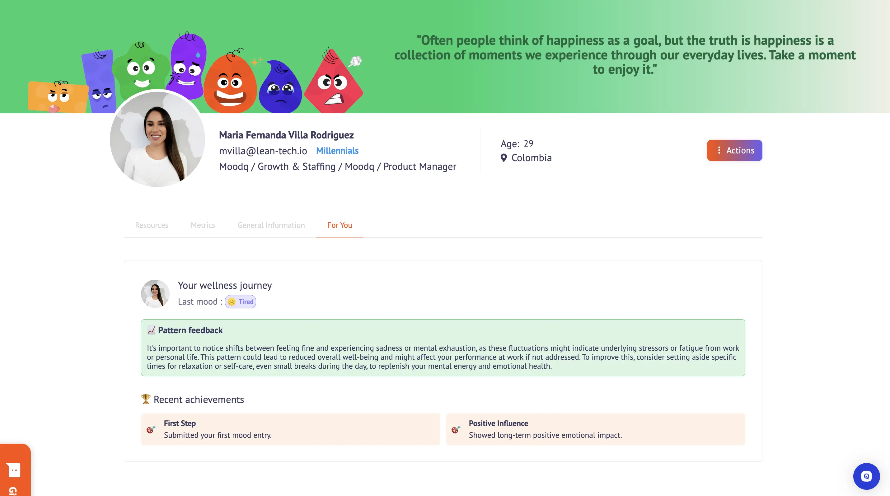 As part of the first version of this feature, users now have access to a new section called "For You" within their profile. This section displays personalized feedback based on their mood history and recent achievements.
